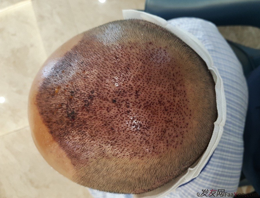 手术台有一头有一个脑袋大小的窟窿,取发时是趴着的,脸正好埋在窟窿里了,大概8点10分,那位主刀医生给我后枕部消毒打麻药,我平时也怕打针的,这次还是在头上打呢,真担心会受不了,当打下第一针后,我才慢慢放下心来,很轻松的打完了麻药,接下来是取发了,可惜自己当时看不到,只听到钻孔一样的声音,一下又一下,一直保持姿势,10点25分,打孔结束,然后简单的包扎了头部,出去吃了个饭,放松了下。