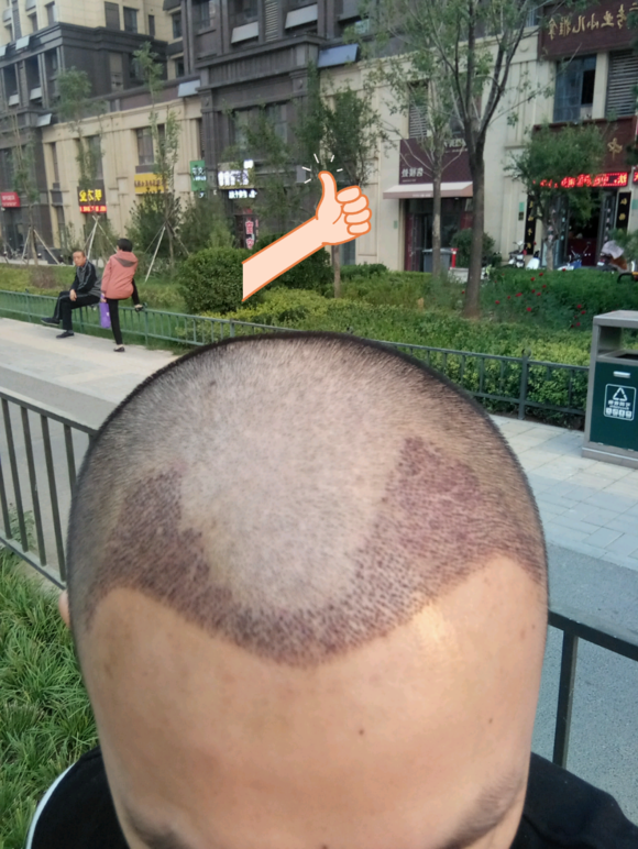 早上7点多我就起床了,是他们给安排的住宿,就在医院里面。早上第一台手术就是我了.剃头,付款,换手术服,签了手术协议。8:20左右进手术室,王医生根据我的特点和我的要求设计的发际线,确定了一下较好的手术方案。进去后开始打麻药,都说打麻药特疼,这个是真的疼,到最后就麻木了。打完麻药后,取发时确实没啥感觉,整个过程几乎无疼痛感,只是听到器械滋滋的声音,就像从我头上取下的毛囊跟不是自己的一样。取发到半个多时的时候,后脑勺中部偶尔会疼几下,随后就正常了。也许是麻药那块比较少吧。取完后,医生们实际多取了180个送我的,让我看了看取出来的毛囊单位,只见几个盘子里堆满了一堆堆的黑乎乎的毛囊,于医生说一堆是10个,排列的很整齐的,2400个毛囊数数的话也要好一会的,我就对医生说既然选择你们对你们我还是很信任的。植发就让我感觉很快了,估计2个半点就完事了,手术很顺利,如果说除去吃饭和休息的时间这个手术时间也就在4个半小时左右,我们住了一晚,医生交代了一些注意事项,第二天就回家了。